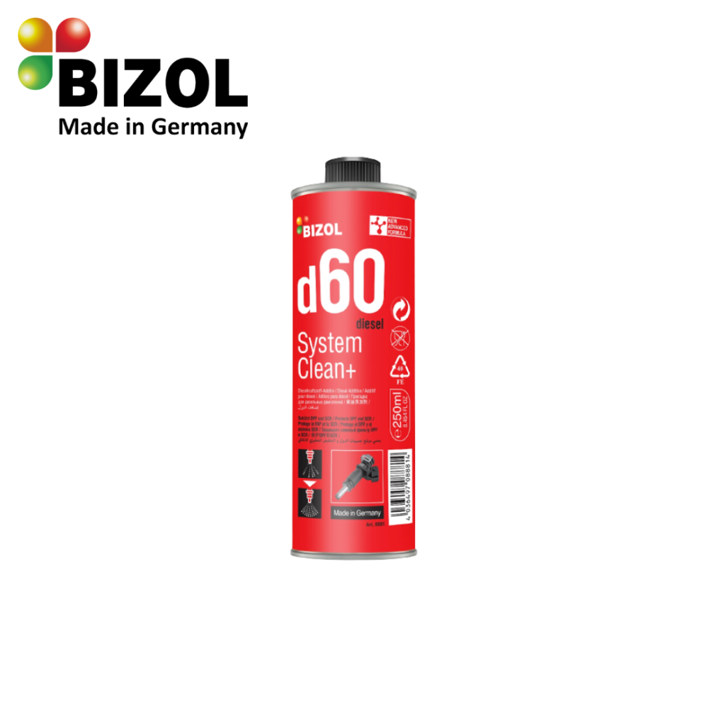 BIZOL Diesel System Clean+ d60 is a fuel additive Made in Germany especially developed for maintaining the entire fuel system. Low or inconsistent fuel quality can cause carbon deposit build-up, inefficient ignition and combustion as well as poor power output. BIZOL Diesel System Clean+ d60 effective cleans the entire fuel system, particularly injectors and valve seats, and prevents from corrosion. This product meets the demands of diesel engines with Common Rail and Pump-Injection high pressure injection and also protects the DPF. It improves the ignitability of the diesel fuel by increasing the cetane number up to 6 points. The regular use of this unique fuel additive leads to lower fuel consumption, noticeably smoother engine run and increased operational reliability.